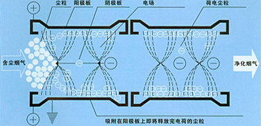 在高压静电场中,气体受电场力作用发生电离,电离后的气体中存在着大量的电子和离子,这些电子和离子与尘粒结合起来,就使尘粒具有电性(绝大多数是负电性)。在电场力的作用下,带负电性的尘粒趋集正极(沉淀极),接着放出电子并吸附在正极上。当此尘粒积聚到一定厚度以后,通过振打装置的振打作用,尘粒被其惯性力从沉淀极表面剥离下来,并落入灰斗,收尘过程即告完成。