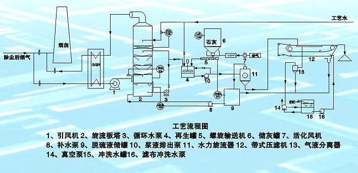 在石灰浆液中,中性的NaHSO3很快跟石灰反应从而释放出[Na+],随后生成的[SO32-]又继续跟石灰反应,反应生成的CaSO3以半水化合物形式沉淀下来,从而使[Na+]得到再生,吸收液恢复对SO2的吸收能力,循环使用。