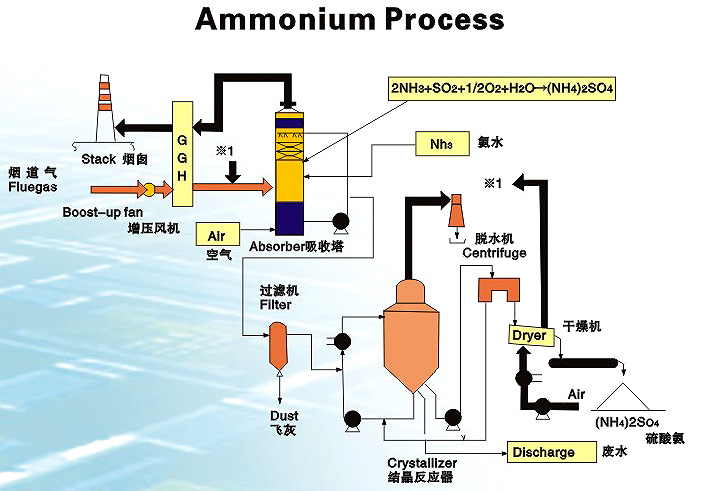湿式氨法烟气脱硫采用氨作为吸收SO2的吸收剂,该法脱硫剂利用率高,可形成氨肥,针对于钢铁企业,可以利用焦化废水治理烧结及自备电厂废气,是一条以废治废的途径。湿法氨法烟气脱硫技术根据吸收液再生的方法不同,可分为氨-酸法,氨-亚铵法和氨-硫铵法等。